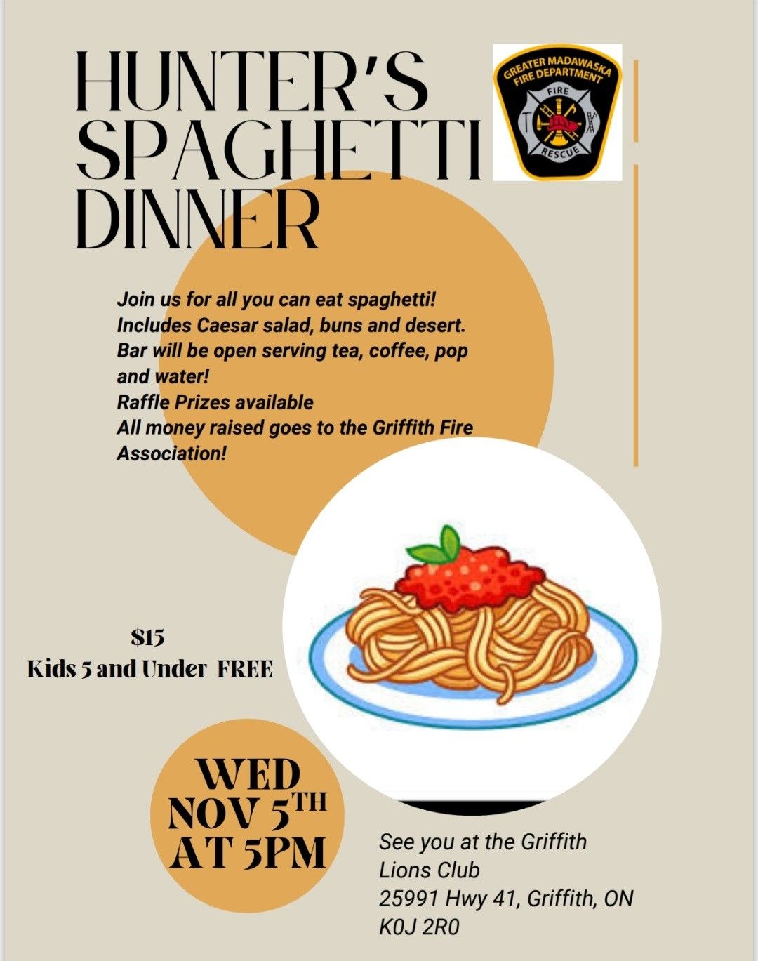 Join the Greater Madawaska Fire Department for a delicious all-you-can-eat spaghetti dinner in support of the Griffith Fire Association!